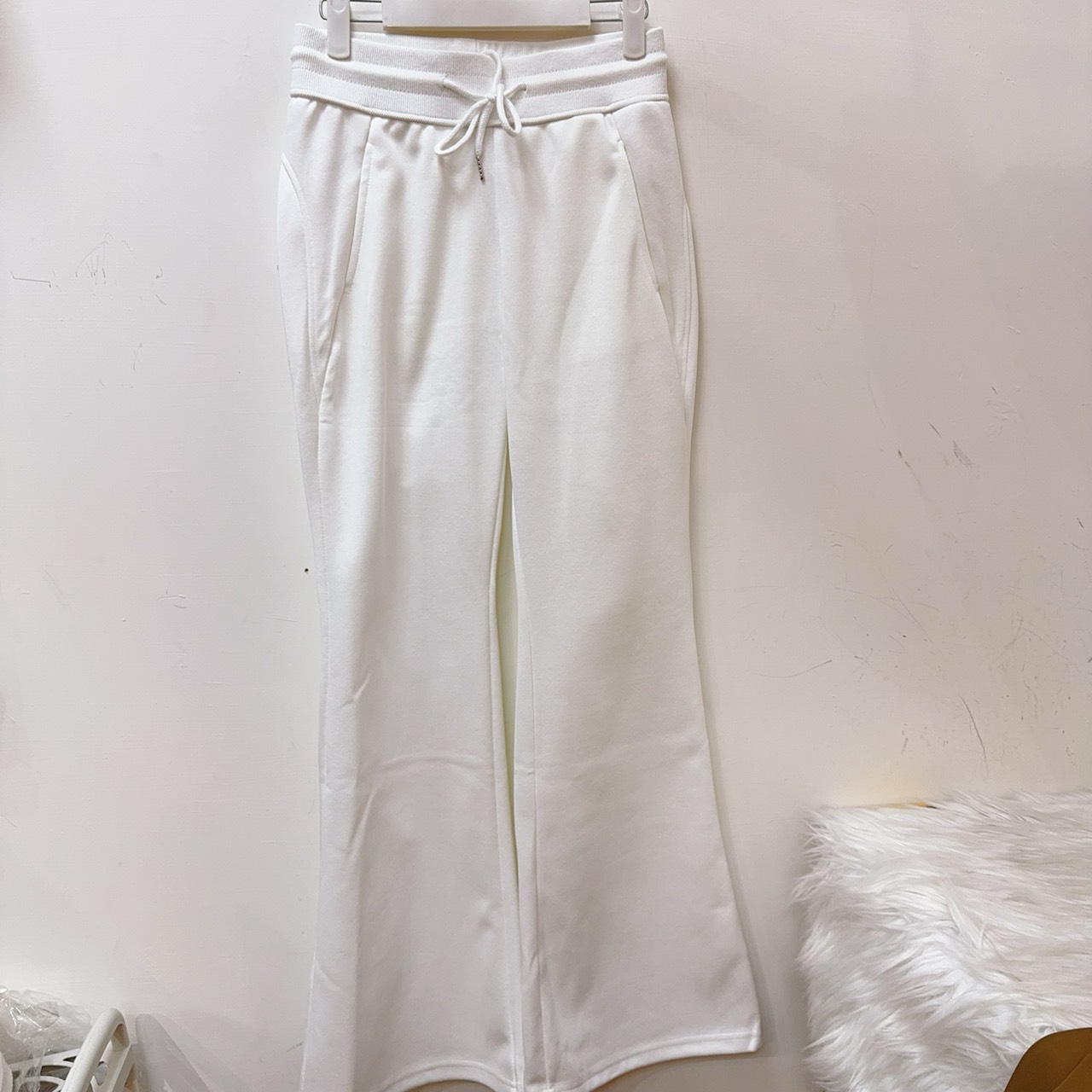 白色高腰抽繩休閒喇叭褲
