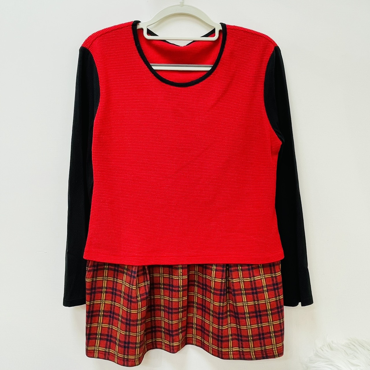 紅黑圓領拼接格長版上衣