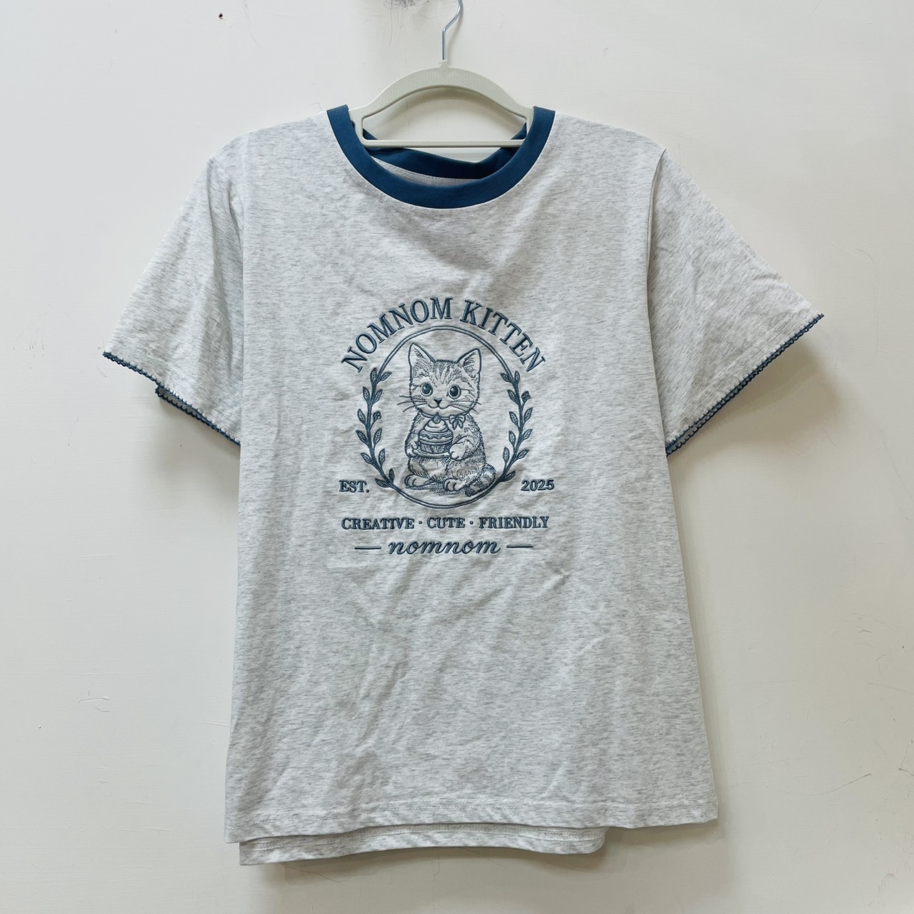藍色滾邊刺繡貓咪灰色短袖上衣