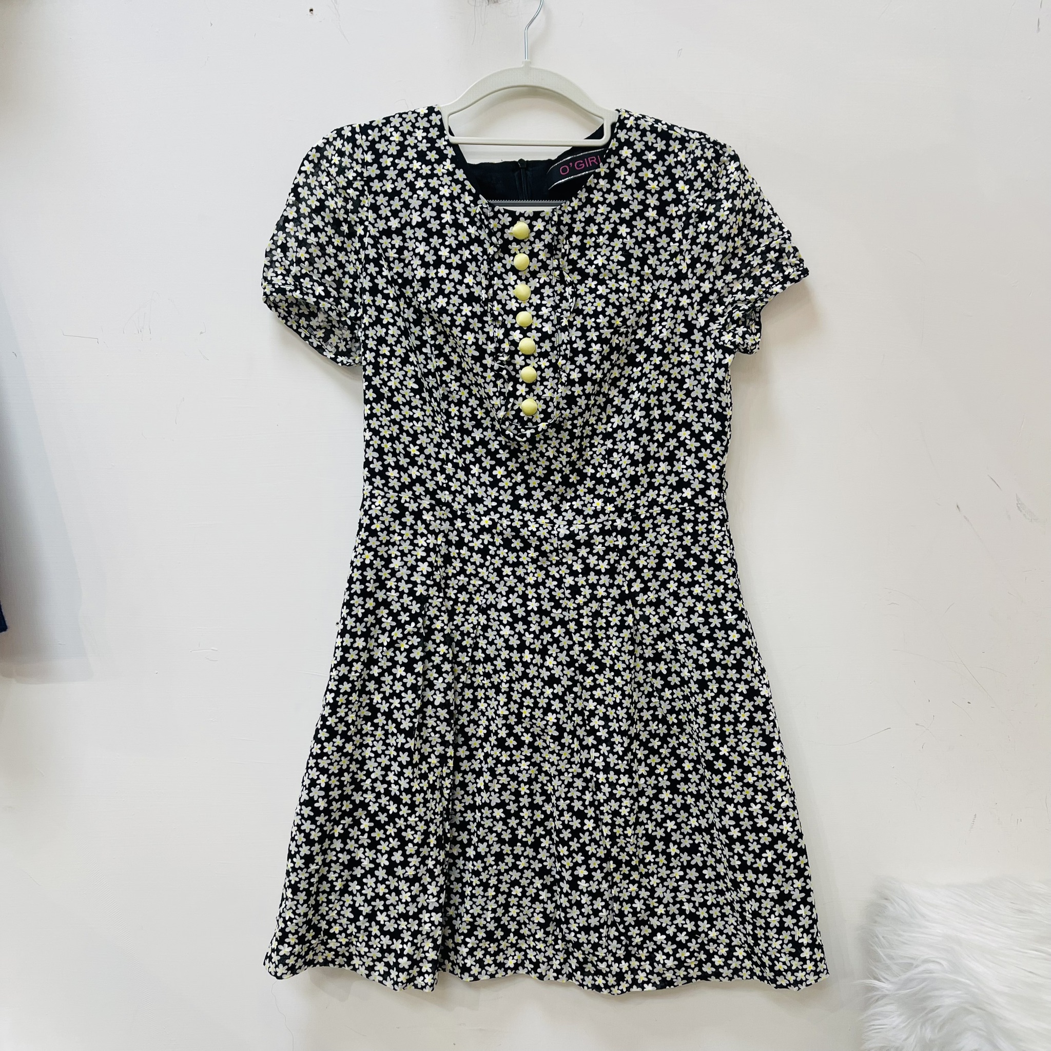 白色小花圖黑色短袖連身裙